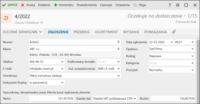2. Na zakładce Zgłoszenie wybrać Klienta, wcześniej stworzony Scenariusz i Rodzaj zlecenia. Można również wpisać szacunkową, akceptowalna przez klienta kwotę Brutto/Netto za naprawę urządzenia