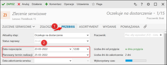 4. Na zakładce Przebieg wybrać datę rozpoczęcia zlecenia i planowanego terminu realizacji, który jest automatycznie wyliczany na podstawie Scenariusza obsługi klienta (pole Czas trwania (dni roboczych)), po czym zatwierdzić Zlecenie serwisowe przyciskiem Zapisz.