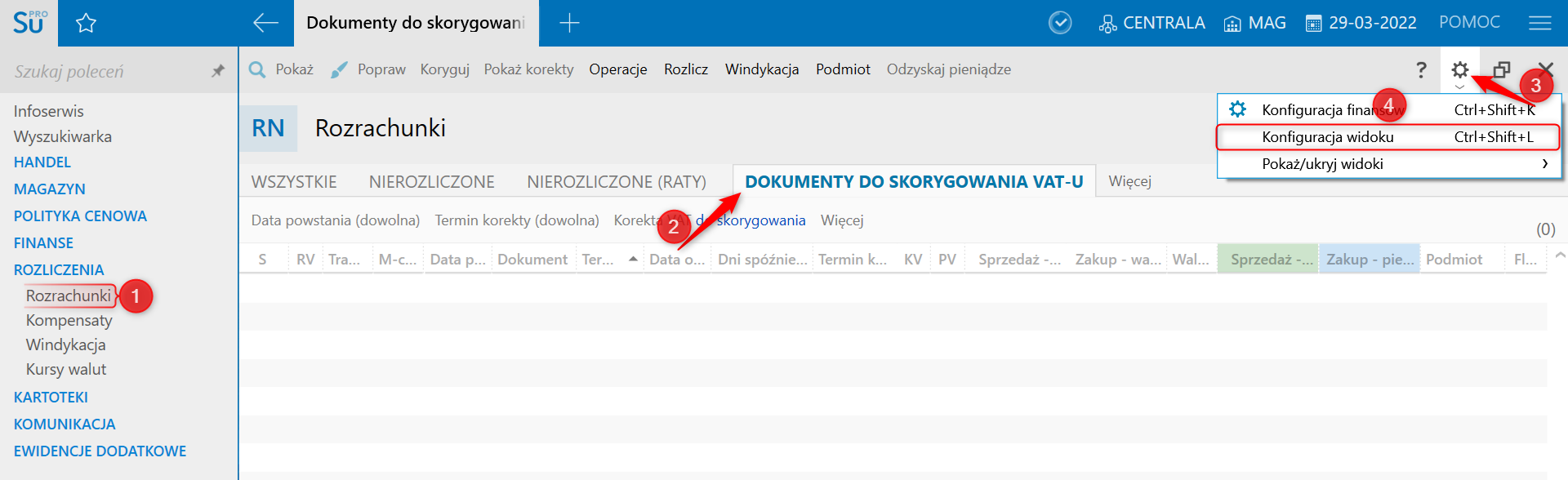 1. Przejść do modułu Rozrachunki, następnie na zakładce Dokumenty do skorygowania VAT–u kliknąć „zębatkę" znajdującą się w prawym górnym rogu i wybrać Konfiguracja widoku.
