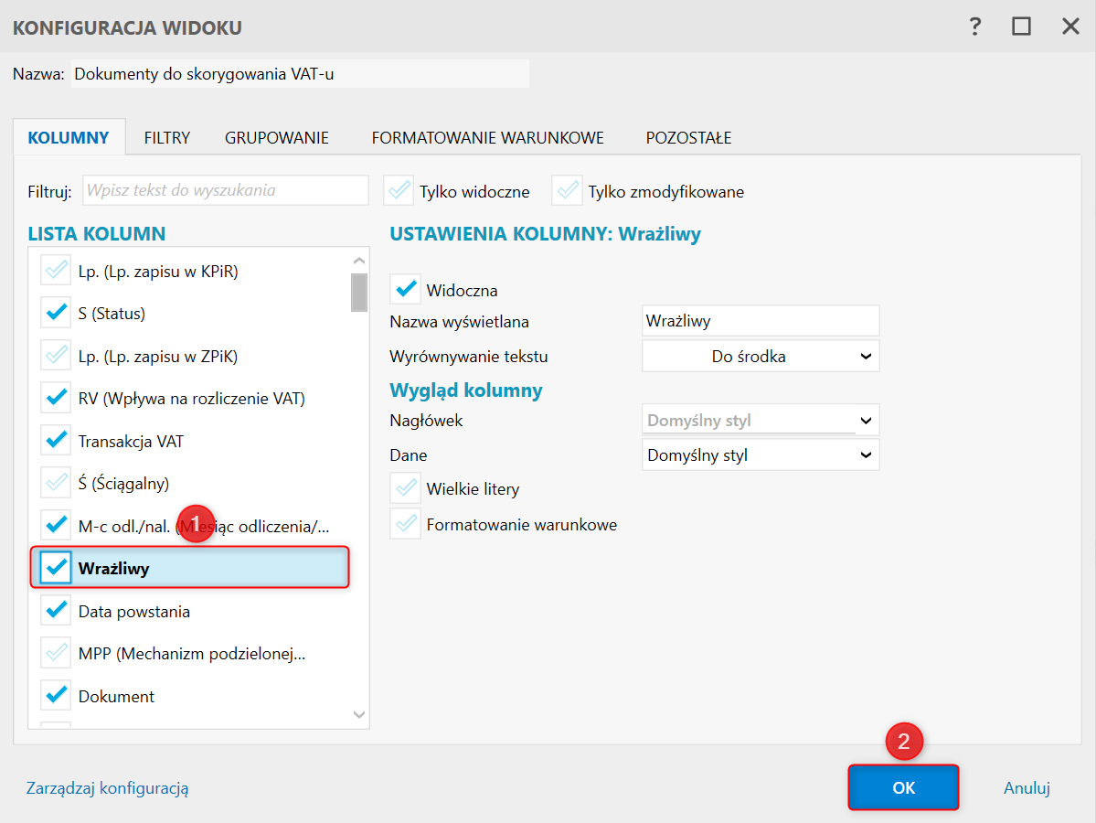 InsERT nexo – Jak do widoku dokumentów do skorygowania VAT-u dodać kolumnę informującą o tym, czy rozrachunek został oznaczony jako wrażliwy?