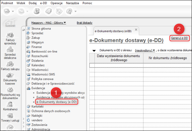 1. Przejść do modułu Ewidencje – e-Dokumenty dostawy (e-DD) i z górnego menu wybrać Generuj e-DD.