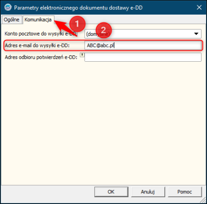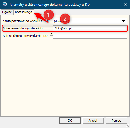 2. Na zakładce Komunikacja wprowadzić Adres e-mail do wysyłki e-DD i zatwierdzić przyciskiem OK.