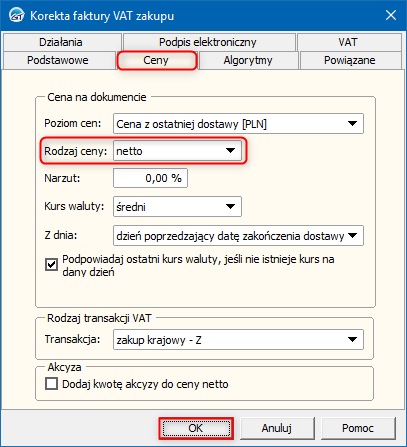 Subiekt GT – Jak ustawić domyślny rodzaj ceny korekty faktury VAT zakupu?