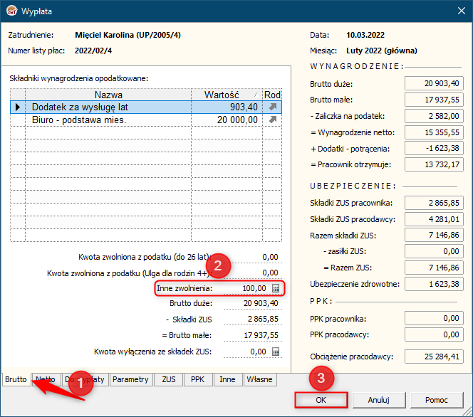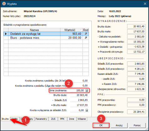 2. Na zakładce Brutto w polu Inne zwolnienia wpisać kwotę, która ma być wyłączona z podstawy opodatkowania. Kliknięcie dowolnego miejsca okna spowoduje przeliczenie wypłaty. Zmiany zatwierdzić przyciskiem OK.