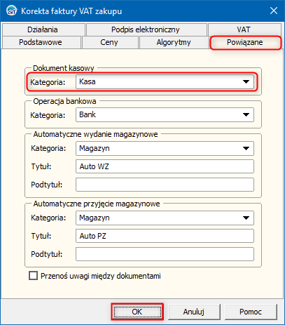 2. W oknie, które się wyświetli przejść na zakładkę Powiązane i wybrać domyślną Kategorię w sekcji Dokument kasowy. Zmiany zapisać przyciskiem OK.