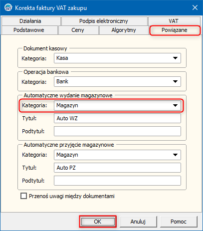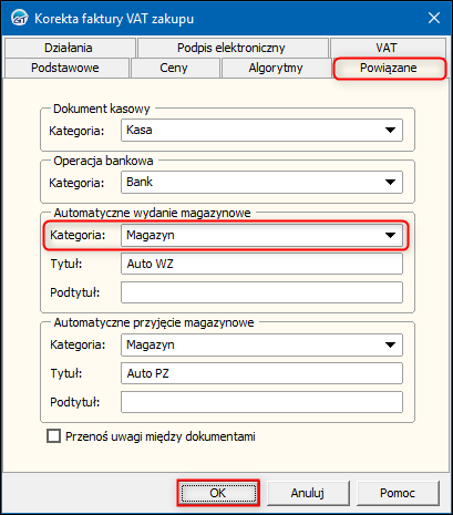 2. W oknie, które się wyświetli przejść na zakładkę Powiązane i wybrać domyślną Kategorię w sekcji Automatyczne wydanie magazynowe. Zmiany zapisać przyciskiem OK.