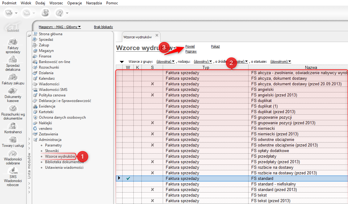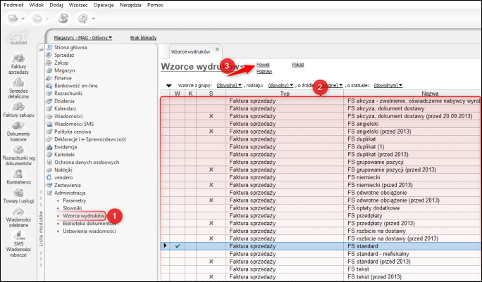 2. Przejść do modułu Wzorce wydruku, zaznaczyć odpowiedni wzorzec i kliknąć Powiel.