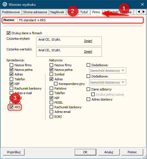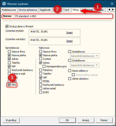3. Przejść na zakładkę Firmy, wpisać Nazwę wzorca wydruku, następnie w sekcji Sprzedawca zaznaczyć znacznik dla KRS.