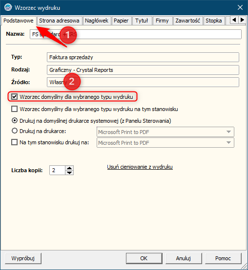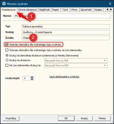 W przypadku, gdy wzorzec ma domyślnie podpowiadać się dla wybranego typu wydruku, należy na zakładce Podstawowe zaznaczyć parametr Wzorzec domyślny dla wybranego typu wydruku.