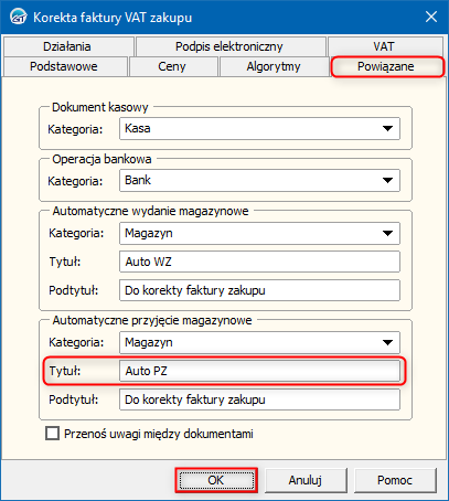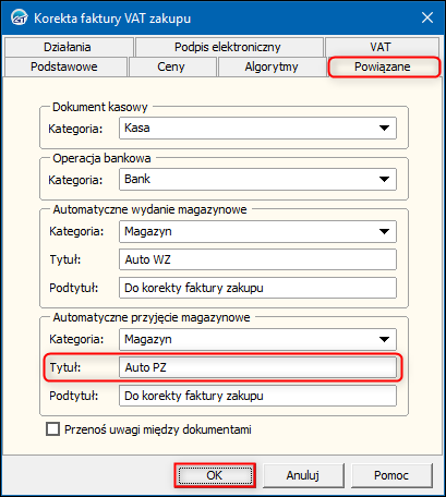 2. W oknie, które się wyświetli przejść na zakładkę Powiązane i wpisać domyślny Tytuł w sekcji Automatyczne przyjęcie magazynowe. Zmiany zapisać przyciskiem OK.