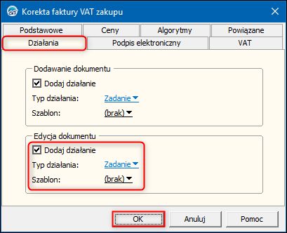 2. W oknie, które się wyświetli przejść na zakładkę Działania, a następnie w sekcji Edycja dokumentu zaznaczyć opcję Dodaj działanie. Następnie ustawić Typ działania, które ma zostać tworzone i opcjonalnie wskazać szablon. Zmiany zapisać przyciskiem OK.