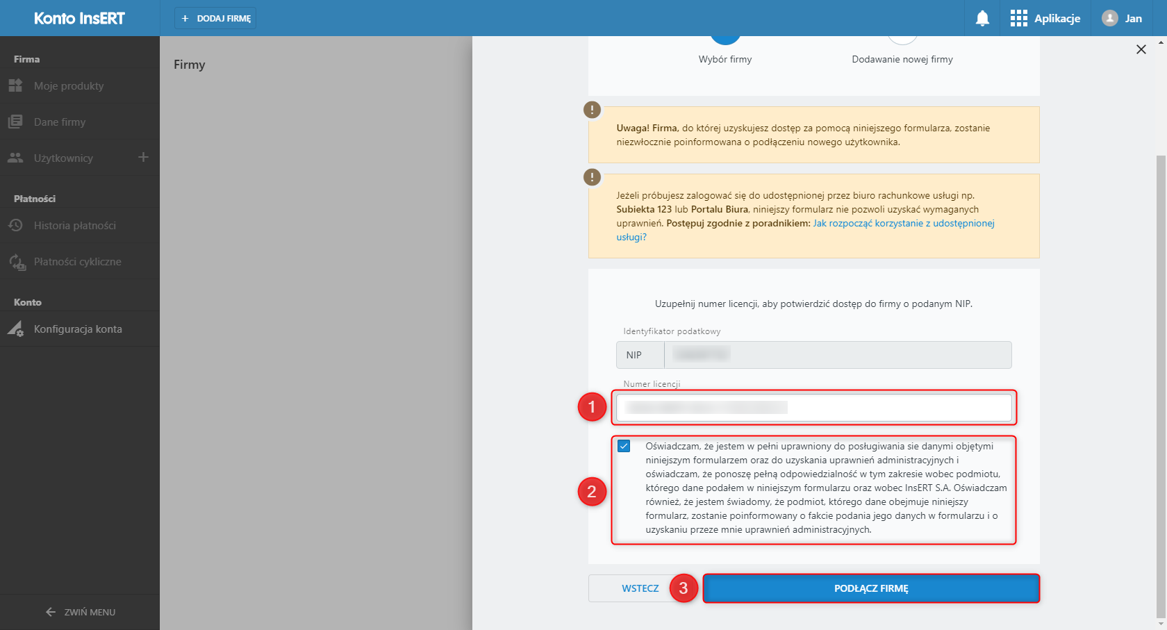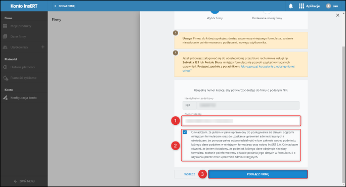 3. Wpisać Numer licencji, który był wykorzystywany przez posiadany wcześniej produkt. W przypadku aplikacji zarezerwuj.pl oraz Subiekt 123 numer licencji można znaleźć w poczcie elektronicznej w wiadomości o tytule [InsERT] Aktywacja aplikacji "nazwa aplikacji", informację, jak sprawdzić nr licencji linii GT można znaleźć tutaj, natomiast linii nexo tutaj. Zapoznać się i zaakceptować oświadczenie, następnie Podłączyć firmę.