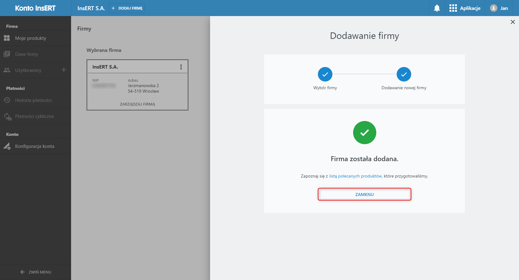 Zostanie wyświetlone potwierdzenie dodania firmy do Konta InsERT. Zamknąć okno.