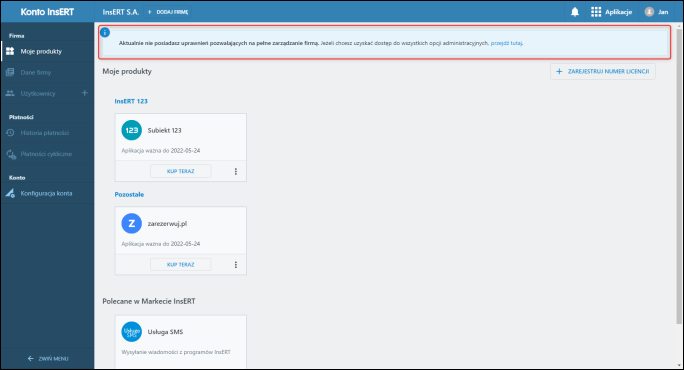 Jeśli użytkownik nie posiada uprawnień administratora globalnego, zostanie o tym poinformowany stosownym komunikatem widocznym w górnej części modułu Moje produkty.