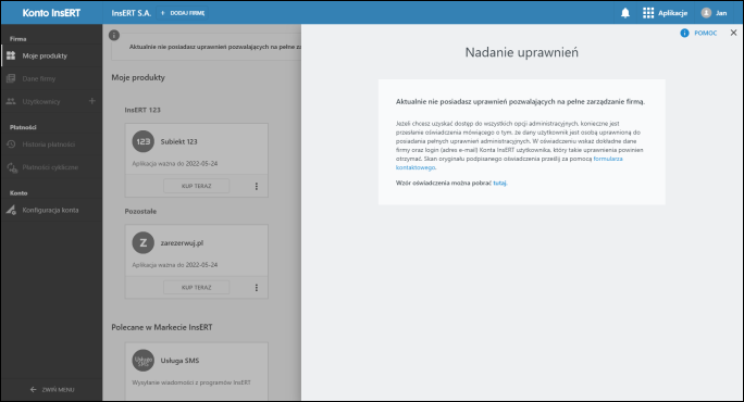 Kolejnym krokiem jest przejście procedury nadania pełnych uprawnień administratora dla konta InsERT, która odbywa się w poprzez przesłanie potwierdzenia w postaci oświadczenia lub jego skanu (skan oryginału należy przesłać przez formularz kontaktowy). W oświadczeniu należy wskazać dokładne dane firmy oraz login (adres e-mail) użytkownika, który takie uprawnienia powinien otrzymać.