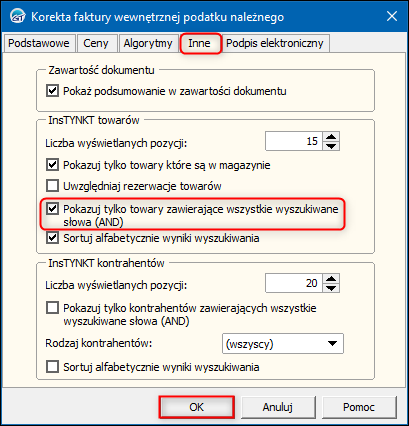 2. W oknie Korekta faktury wewnętrznej podatku należnego przejść na zakładkę Inne i zaznaczyć opcję Pokazuj tylko towary zawierające wszystkie wyszukiwane słowa (AND) w sekcji InsTYNKT towarów. Zmiany zapisać przyciskiem OK.