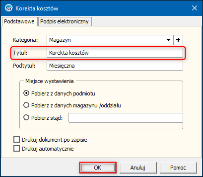 Temat należy do Parametrów korekty kosztów dokumentów.