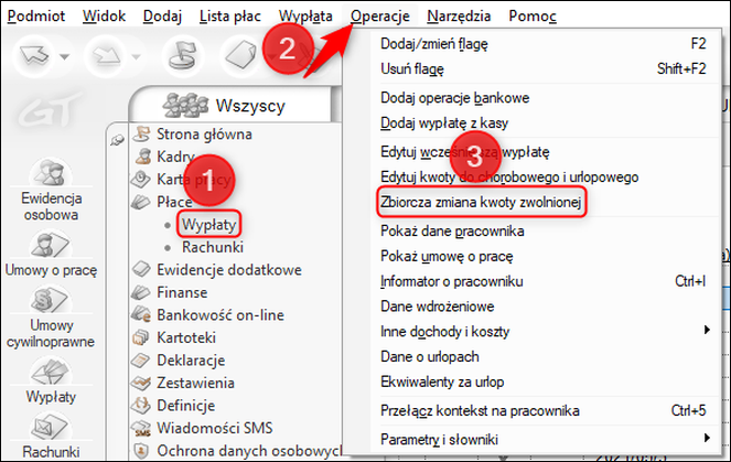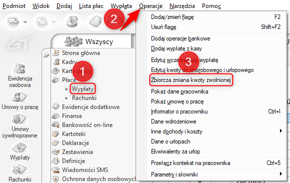 1. Przejść do modułu Płace – Wypłaty i z górnego menu wybrać Operacje – Zbiorcza zmiana kwoty zwolnionej.
