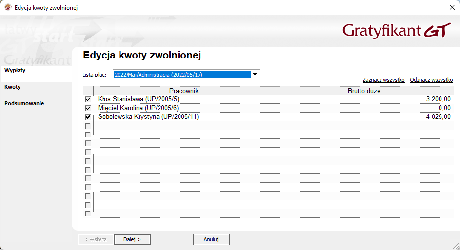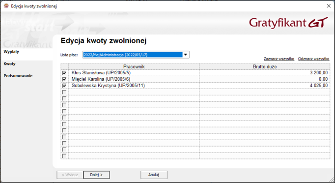 2. W górnej sekcji wybrać listę płac, następnie zaznaczyć pracowników i kliknąć Dalej.