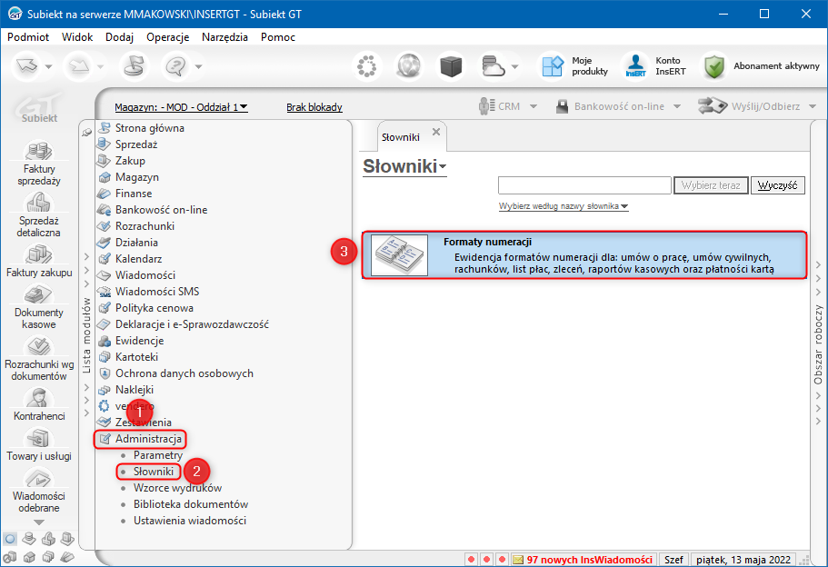 1. Z listy modułów wybrać Administracja – Słowniki, a z listy słowników Formaty numeracji