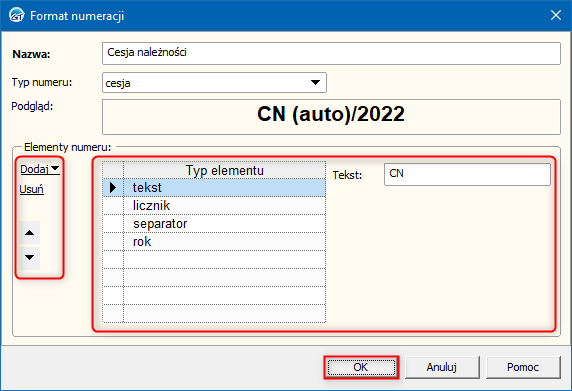 ​3. W sekcji elementy numeru można Dodawać i usuwać elementy wchodzące w skład numeru. Zmieniać kolejność elementów można za pomocą strzałek znajdujących się pod opcjami Dodaj i Usuń. Dostępne są następujące typy elementów numeru: