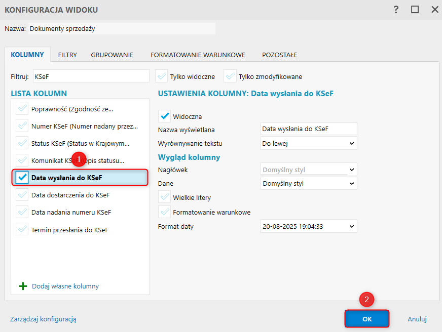 2. Na zakładce Kolumny odnaleźć i zaznaczyć kolumnę Data wysłania do KSeF, a zmiany zatwierdzić przyciskiem OK.