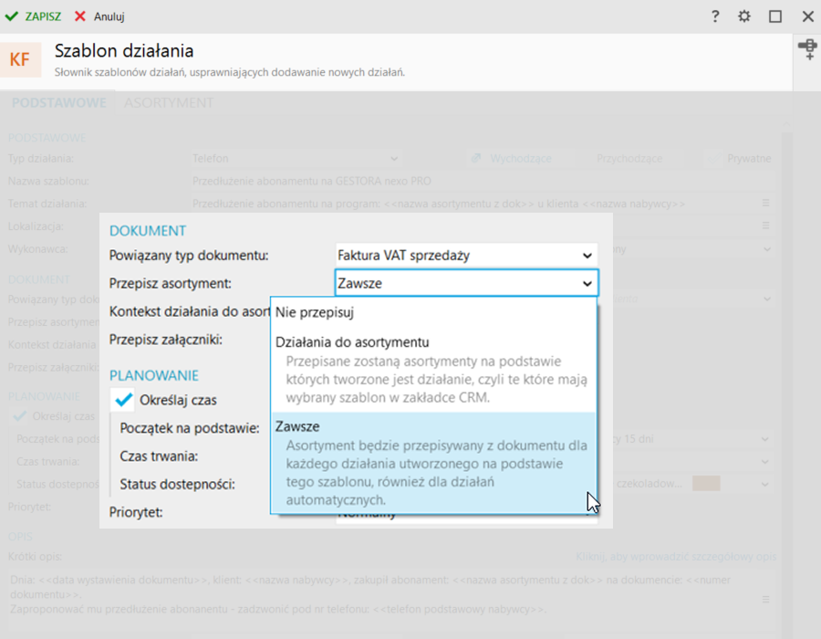 Przepisywanie asortymentu do działaniaW szablonach działań dodano możliwość ustawienia, aby asortyment z dokumentu, na podstawie którego tworzone jest działanie, był przepisywany. Dotychczas asortyment mógł być przepisywany jedynie do działań tworzonych automatycznie.