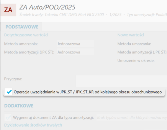 Zmiana sposobu amortyzacji w pliku JPK środków trwałychW dokumencie ZA dodano oznaczenie czy zmiana sposobu amortyzacji środka trwałego ma być wykazywana w pliku JPK środków trwałych w bieżącym roku czy w roku kolejnym.