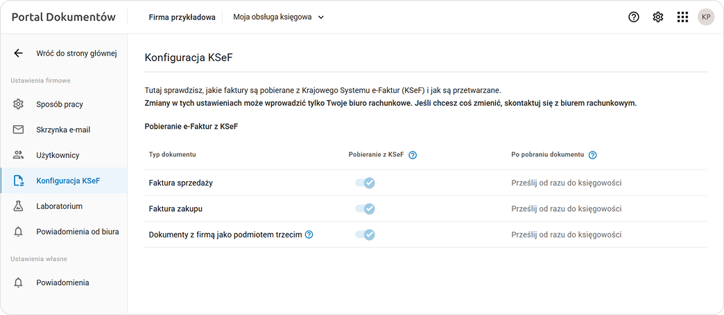Te ustawienia będą widoczne w Portalu Dokumentów (tylko do odczytu) w zakładce Konfiguracja KSeF - ich zmiana możliwa jest wyłącznie z poziomu programu księgowego.