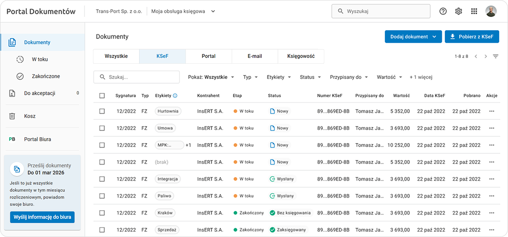 Portal Dokumentów to rozwiązanie, które umożliwia obieg dokumentów i opisywanie e-faktur pobranych z Krajowego Systemu e-Faktur (KSeF) przed przekazaniem ich do księgowości. Aplikacja umożliwia również szybkie przesyłanie e-faktur do programów księgowych Rachmistrz i Rewizor, co pozwala znacząco skrócić czas ich przetwarzania. Dzięki temu proces obsługi dokumentów jest uporządkowany, sprawny i dostosowany do różnych scenariuszy pracy.