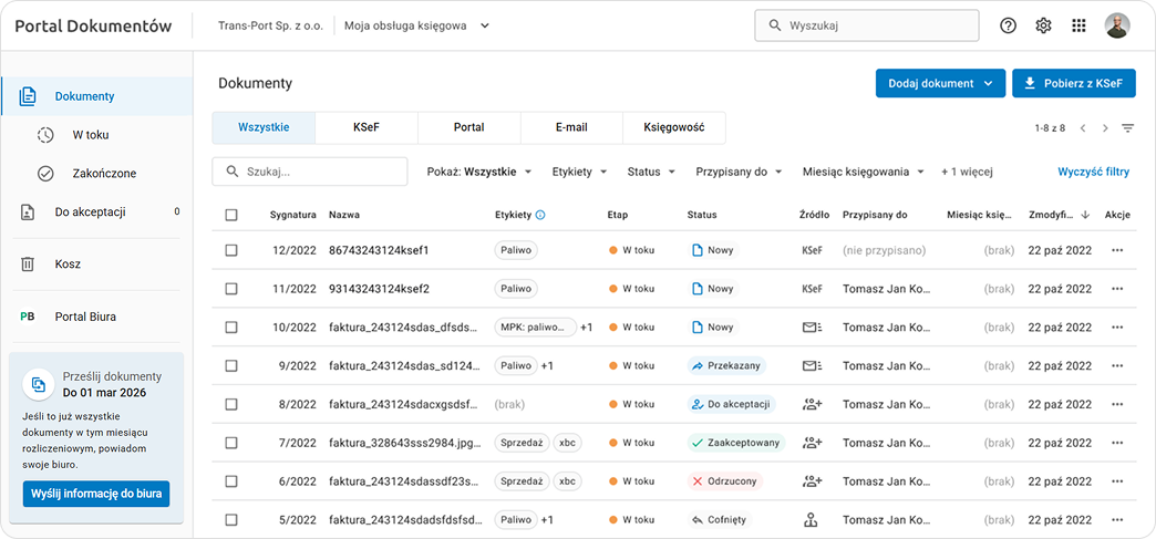 W Portalu pojawią się nowe zakładki, które pomogą łatwo odnaleźć dokumenty według ich źródła. Każda zakładka reprezentuje inne pochodzenie dokumentów:
