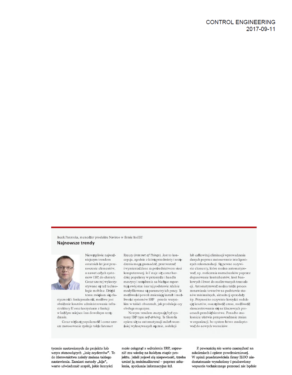 Miesięcznik publikuje wywiad z Tomaszem Sokołowskim, dyrektorem marketingu i sprzedaży w InsERT S.A. nt. rynku systemów ERP, Navireo i jego sieci dystrybucyjnej.